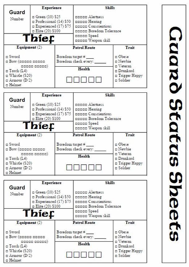 "Concept: A primarily two player game. One player is the owner of the mansion, the other is the thief. The owner spends resources to set up the mansion, and the thief tries to steal the treasured item. The behaviour of the guards in the mansion are mostly automated responses. If more than two players - then the additional players are additional thieves."...