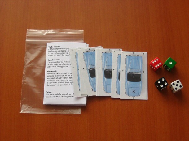 A 2-4 player game of changing lanes, high-speed turns, and flipping people off. Game Summary: Players move their car from row 1 to row 15, avoiding traffic and influencing other cars to get in the way of their opponents. Components: A bunch of toy cars (ten or more works well), of roughly the same size. A six sided die for each player. One sheet of scrap...