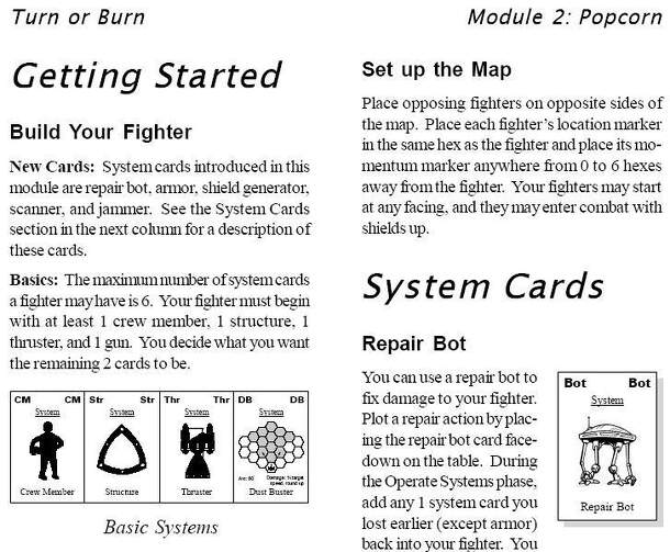 Turn or Burn is a print-and-play game of space fighter combat for 2 to 8 players. To start a game, players design their fighters from a deck of system cards. Each turn, players plot a single action by playing a system or maneuver card face down. After everyone has played a card, the actions are revealed. Movement is governed by Newtonian mechanics in 2...