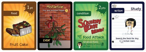 It's almost winter break, but the cafeteria food fight isn't over until all the fruitcakes are lobbed... Funded on Kickstarter, What the Food?! is a fast playing card game for 3-8 players. These 4 special bonus cards were created as a thank you gift to backers and specifically for the BGG store. Includes an action, food, condition and event card to spice...