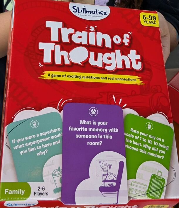 Train of Thought is a card game that inspires real connections and meaningful conversations. "What is something you learned today?" "Describe your favorite memory with one of your friends". With thoughtful questions, prompts, and challenges, the first one to complete their "train" of thought, wins the game! HOW TO WIN: Each player draws a card from the...