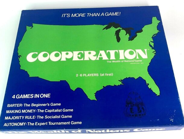COOPERATION: The Wealth of Nations Game is a boardgame simulating economic systems. It includes four different variants of different skill levels based on different economic systems. BARTER is the beginners' game, MAJORITY RULE is the socialist game, MAKING MONEY is the capitalist game, and AUTONOMY is the expert tournament game. The game plays up to six...