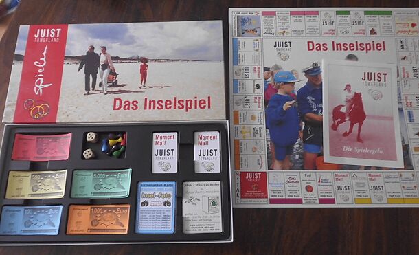 Commercial game, related to Monopoly, for the purpose of promoting Juist, part of the German East Frisian Islands. The players move around a board consisting of 40 squares. Most of the squares are showing companies to be bought - with values between 1000 and 8000. Three companies are forming a set with the same colour. Whenever a player lands on a...