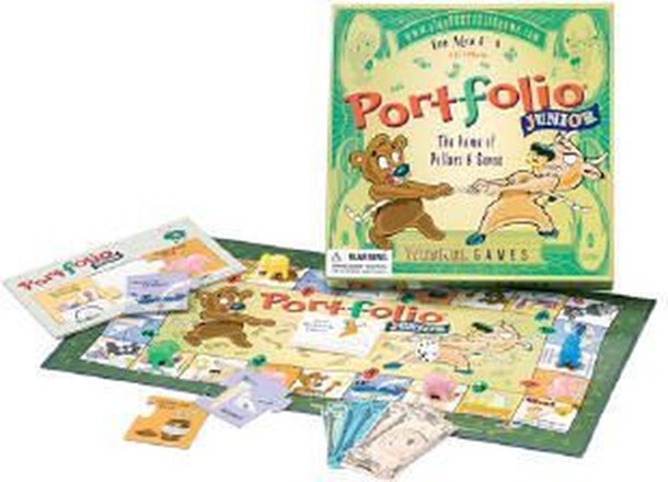 A fun fast-paced game where young players compete to fill their Portfolio Junior puzzle card by simply purchasing three distinctly different shaped puzzle pieces. Kids move their Piggy Bank playing piece around the board acquiring Lemonade & Ice Cream Companies, Airport & Baseball Stadiums, and Cookie Jars & Piggy Banks, located inside the colored spaces....