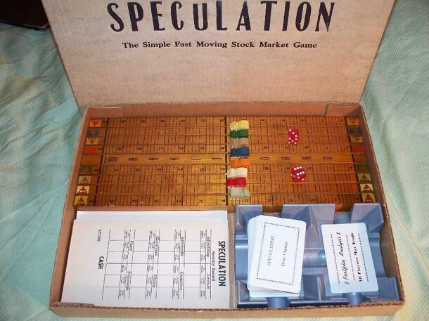 Speculation is the simple fast moving stock market game that embraces the quick fluctuations in price typical of the market of speculative securities. The object of the game is for each player to increase his beginning net worth of $12,000 by "buying low" and "selling high" as prices of individual securities rise and fall on the Market Board. The wooden...