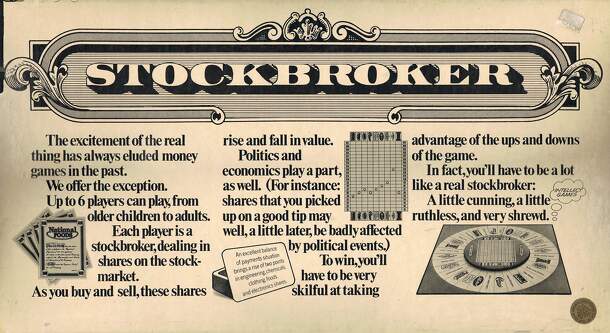 Rare board game set around buying and selling stocks and shares determined by advantage and dis-advantage squares on the playing board, the game is for 3 to 7 players. Each player takes the part of a broker and is dealt stock cards and money to start the game. Play moves around the board on the throw of the dice. Do you sell shares or buy shares? You could...