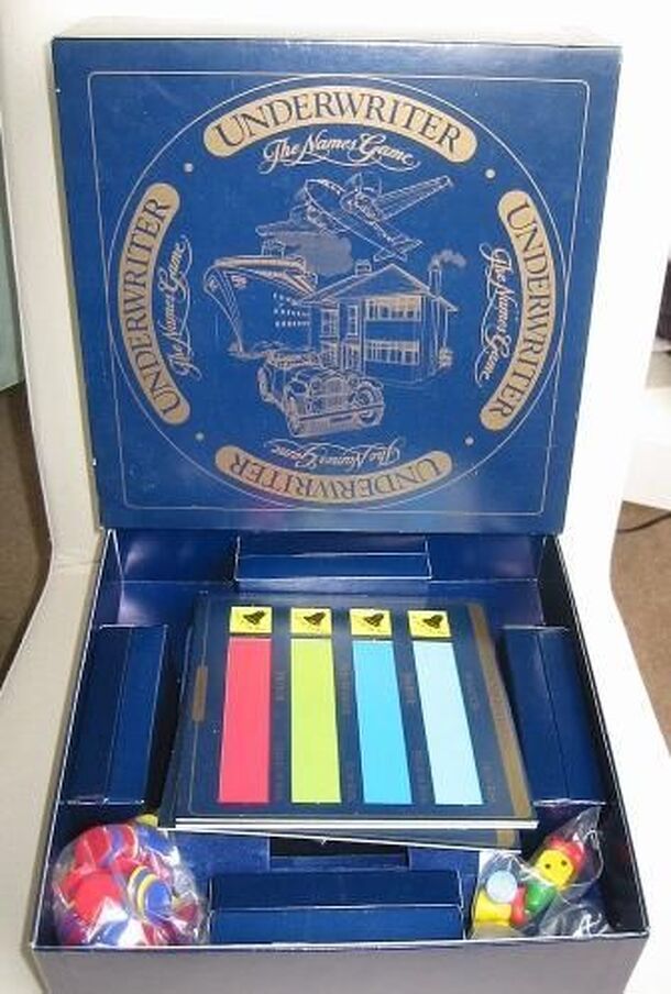 Underwriter, The Names Game, is an insurance game in which 4 players become Names at Lloyd's of London, taking on risks in the Aviation, Marine, Non-Marine and Motor markets. Each player has a Syndicate board and puts tokens into each Market slot. You roll and move round the board, drawing the relevant market card which may show a profit or loss (eg...