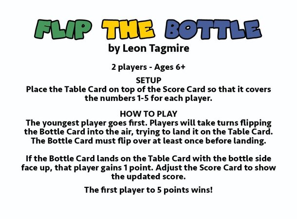 Flip the Bottle is a 2 player game that uses three cards: a rules and score tracking card, a table card, and a bottle card. Players take turns flipping the bottle card and trying to land it bottle-side-up on the table card to score a point. The first player to five points wins the game. Released in the September 2017 Board Game of the Month Club $5+...