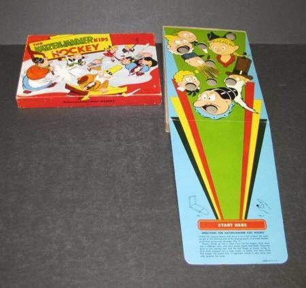 Game of skill for two or more players. Players place a die in a bucket at the top of a pole that has a target on the bottom. They then shoot a marble at the target to drop the die onto the playing board. The player then receives points equal to the total of the die and the number of the square the die fell into. If die does not fall, player only receives...
