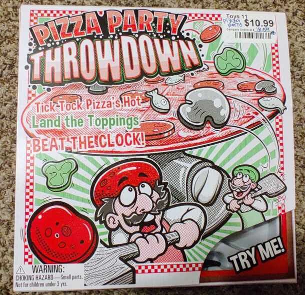 Pizza Party Throwdown, the crazy new pizza toppings game! Players have 30 seconds to toss their “ingredients” onto the rotating pizza game board. It’s a rush against time to land your ingredients on the pizza before it finishes “baking!” Each player selects their color-coded ingredient – like pepperoni, peppers, mushrooms and of course, anchovies! Launch...