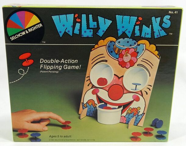 I hope you are not afraid of clowns! This game uses a stand up cardboard clown with white cup eyes and a cup for a mouth! Unlike the traditional game Tiddly Winks, this plays much different and uses a special playing piece that they call a "Wink" which is a wink connected to a wink and each wink side has a different texture on it. There is a smoother side...