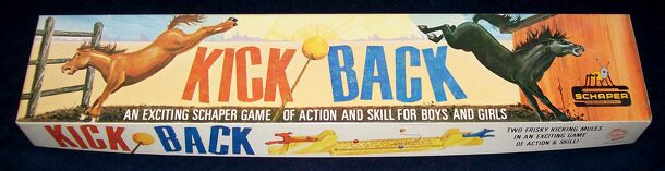 The game consists of a narrow plastic board about 20" long with a plastic 'kicking mule' in a "corral" at either end. A small plastic ball is connected to a length of string which originates from the center of the board. A scoring track runs along each edge of the board between the corrals. Players take turns placing the ball on the hind feet of their...