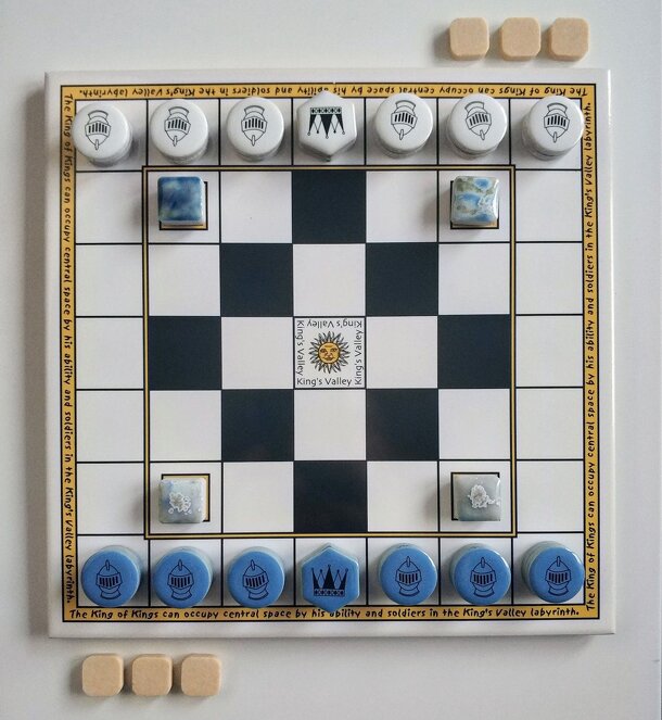 King's Valley Labyrinth is a new extension game of King's Valley. Board size is enlarged to 7x7 square grid and 4 pillar stone spaces are added. As in the original game the simplicity of the game stems from the fact that the movement of all the pieces is the same. All pieces move horizontally or vertically or diagonally. But when a piece is moved it must...