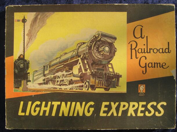 A family game from the pre-war times (estimated). Players move their pawns round the railroad track according to the throw of two dice. The board is part of the game box basement. The track is colour-coded, so every time you land on a given colour you have to put a passenger chip (from your starting amount) into the station of the corresponding colour. To...