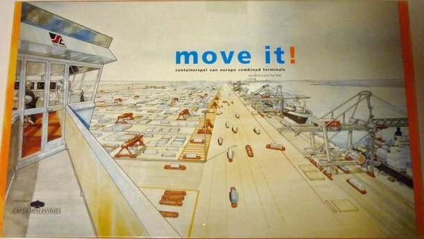 Move it! is a simple game simulating the transport of containers at the Europe Combined Terminals. You have to move little wooden containers from a boat to one of a maximum of six stacks (rows) and then onto a truck to be transported over land. Players can block each other by stacking containers on top of each other. Decreasing the amount of stacks in play...