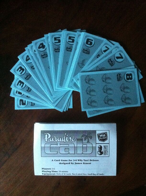 Paradise Cab is an update of the game 'A Short Bus To Paradise' which used a standard deck and was part of 'Chief Herman's Next Big Thing'. The game concerns filling your cabs up with tourists arriving from the a nearby cruise ship. You compete with the other players who also have their own cabs. Points are scored by loading a cab with a single color of...