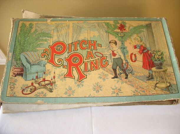 From game box inside: 4398 THE THREE GAMES OF PITCH-A-RING CROWN THE KING AND RING TOSS These games may be played by two, three of four persons. Directions For Playing Pitch-A-Ring Remove from the box, and inset the tall post in center socket (wooden post 9" long) of wooden frame (two wooden interlocking pieces 11" long). The player takes his position at...