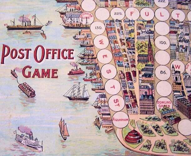 An early Parker Brothers game from 1898. Post Office Game revolves around the dense cityscape and urban hustle and bustle of lower Manhattan at or near the turn of the century. Players travel along a game board from streets on Manhattan's Southern tip ( South Ferry, Aquarium, Wall Street and the Wall Street Ferry all the way North to 23rd Street). Places...