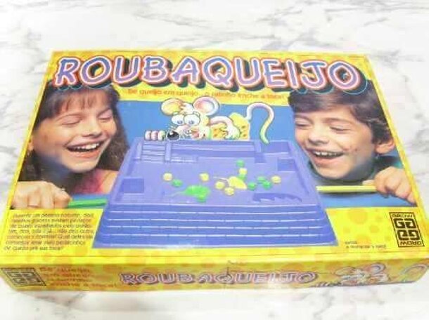 "Rouba Queijo" means, in a free translation from portuguese, "Stealing Cheese". It's a two player game where each player takes control of a mouse and need to put as many cheese as they can in their respective holes. The board is a high-relief thin bubble plastic representing an old basement and the cheese are represented by small dice. There's a magnet...