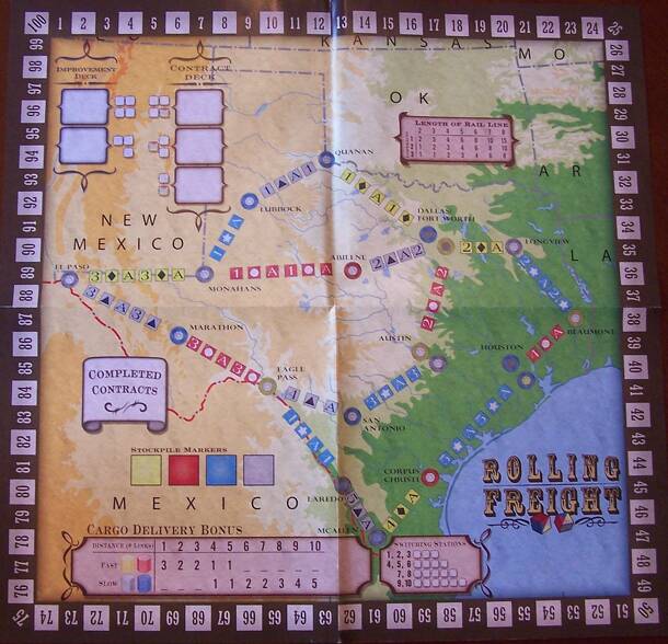 The Texas Map for the Rolling Freight game was made available as an exclusive item to people that pledged to support the Rolling Freight project on Kickstarter. This map was designed to be an apegames.com download, but was instead printed copies for each copy of the game that we ship for Kickstarter backers. It was printed on thick paper and quarter-fold...