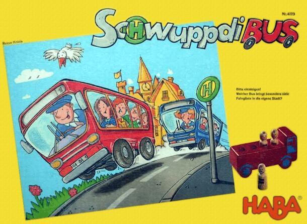 To play Schwuppdibus, each player chooses a town and begins with the bus of the same color in the opposite side of the board. On their turn, a player roles the dice and moves the bus forward and depending on the squares they land on, there are different actions to perform. At a green light, one may roll the dice again and at a bus stop, passengers get on...