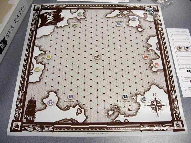 As the rules put it "The object o' Sea Rats! is to be the last pirate afloat". Each player starts with one ship, six cannonballs, and six crates of supplies used to repair damage. The ships are positioned on a sea map board that can be rolled up for storage. Each ship starts at a different port. Cargo can be gained or lost by moving to ports, fighting...