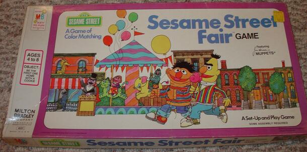 Description from rules: Come on over to Sesame Street and be there for a STREET FAIR. Grover is serving cookies from his stand, and the merry-go-round is beckoning. You might even get your picture taken by Maria. The winner is the first player to arrive at 123 Sesame Street with a cookie. For a longer game, get 3 cookies. Go back to start and go around...