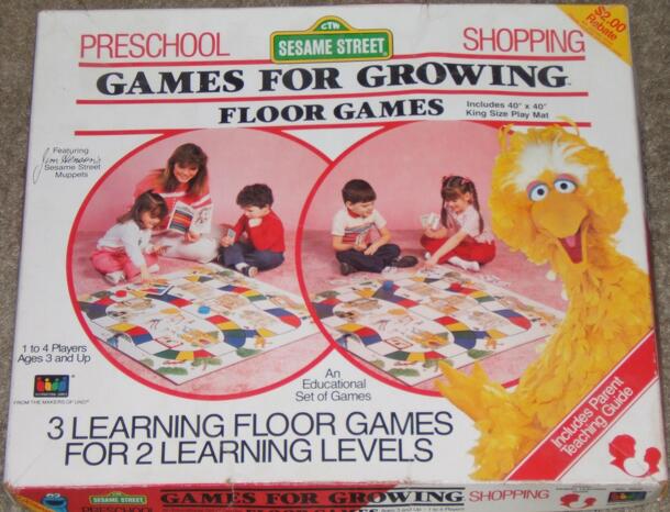 Sesame Street Preschool Games for Growing-Shopping Set "is designed to help your child learn about earning, saving, and shopping wisely." The set contains 3 Main Games and 2 Introductory Games The Introductory games introduce the board and cards to younger children. Game 1 Fun to Earn: Uses the bottom half of the Board. Players take Job Cards from the Home...
