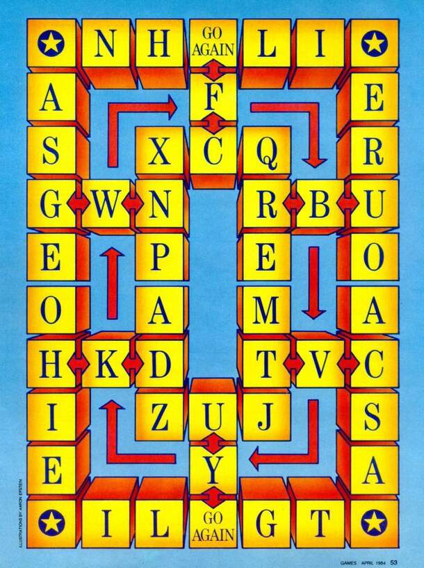 "A Two-Player Board Game in Which Stealing is Stylish" The gameboard is printed in the magazine. There are two 'tracks', an outer and an inner track, and 6 spaces where you can move from one track to the other. Spaces have either a letter, a Star (scoring space) or 'Go Again' on them. Movement on the board is clockwise. Other equipment needed: two tokens...