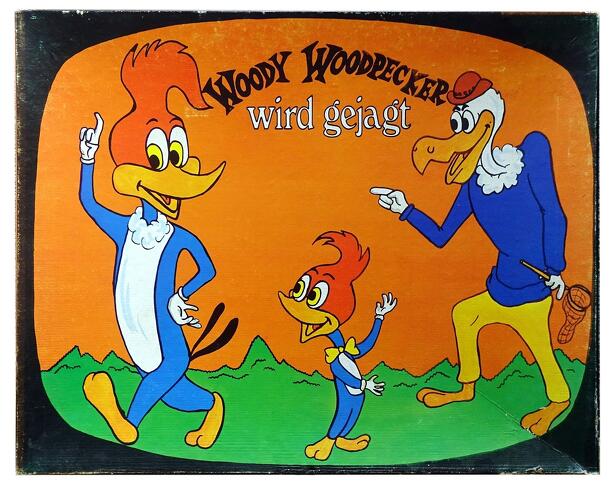 One player (Woody Woodpecker) starts at the red center space. The other players start at the corners of their color. Movement is determined by a die. Woody Woodpecker may move in any direction, the hunters may only move forward. They are only allowed to use the blue dots if they are on a rectangular blue space and roll a 1 or a 6. If a hunter player...