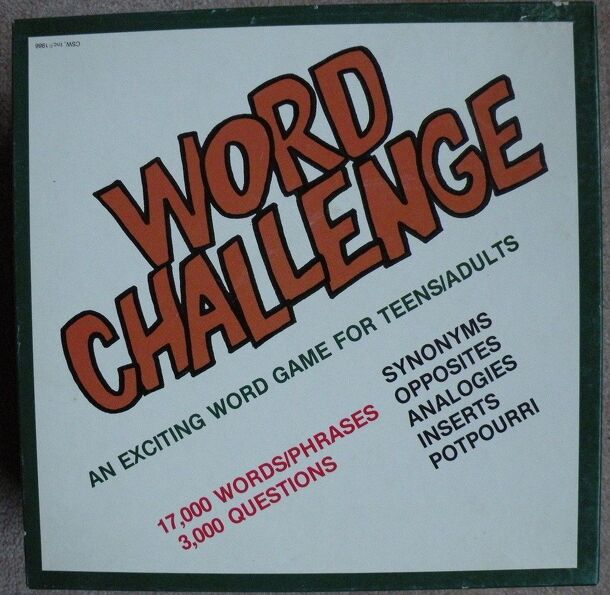 (From the box) An exciting word game for teens/adults. Roll the die. Land on a question category. Answer a question. Score points. Frustrate your opponent's play. "Word Challenge" is a fast-paced word relationship game designed for teenagers and adults. Winning requires a combination of knowledge, strategy and luck. The objective is to score 800 points by...