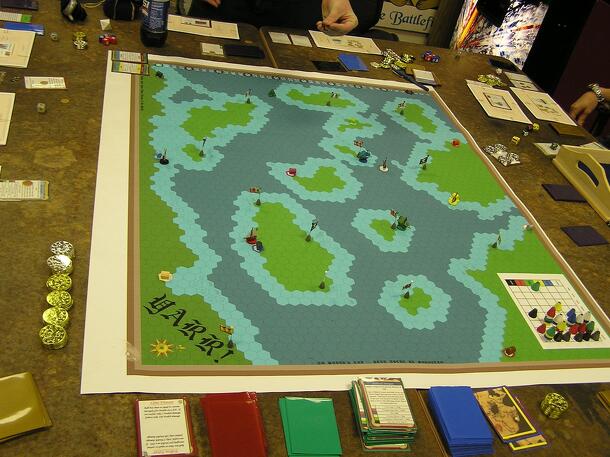 YARR! is the newest game set in the 'Age of Piracy.' All the things you've wanted in a pirate game including: 6 separate nationalities to play. 18 distinct captains to choose from, each with their own strengths and weaknesses. 5 different ships all with varying stats for speed, attack and defense dice, crew capacity and more: Schooner, Sloop, Barque...