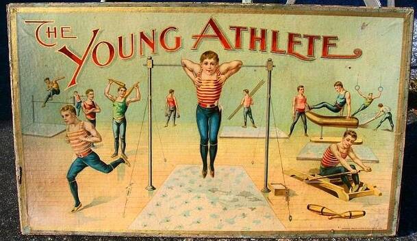 A simple children's "racetrack" style game where the goal is to be the first to reach the finish. The path portrays various sports and gymnastic exercises (such as a vaulting horse, wrestling, pole vaulting). After meandering through the center of the board, the game path finishes on a running track that circles the entire playing board. The pawns are...