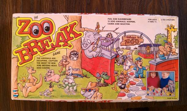 From the front cover: The animals are escaping. Capture the most to win and become head zoo keeper. User summary: A roll-and-move game where the players are zookeepers trying to catch all of the animals that have escaped from the zoo. Based on the roll of a die in the game's unique elephant dice tower, a player will either move his pawn the indicated...