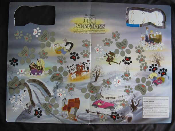 Cruella hired Horace and Jasper to kidnap lots of Dalmatian puppies. She wants to make a fur coat out of them. Can you help Perdita and Pongo find all of them and bring them back home? Published as part of Disney's Giant Board Game Book, 101 Dalmatians is a roll-and-move game where players take the part of the Dalmatian parents Pongo and Perdita, trying to...