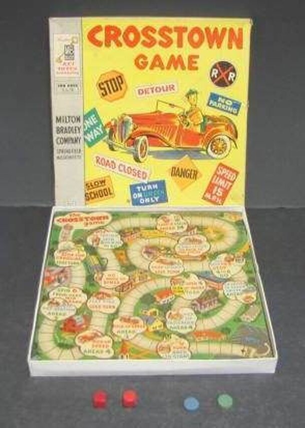 Simple roll and move game using a transportation theme. The instructions on the box state: "CROSSTOWN GAME -- for 2, 3, or 4 Players -- The object of the game is to be the first player to drive all the way through the town, obeying every sign on which his sports-car stops. (1) Each player uses a colored disk to represent his car. (2) All cars go from START...