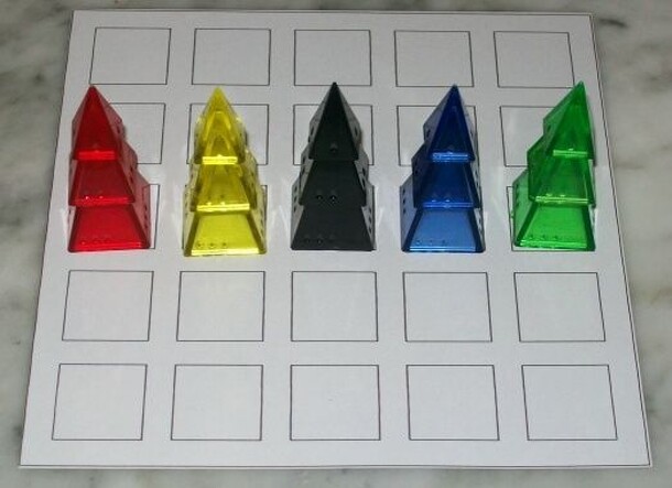 In this Icehouse game, two players are racing their trios of pyramids in opposite directions along a five-square line. Pedestrians line the path to block you or your opponeent. During your turn, you roll a die and MUST use all your movement points that turn. You can move either your own pieces or the pedestrians. The first player to get their trio home...