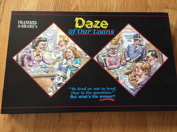 Daze of Our Loans is a game for anyone with a sense of humor. The players are "lenders" that move around the board making loans and, sometimes, recovering on them. With luck they may even obtain collateral. When circumstances warrant, loans can be sold or participated out to others. Meanwhile, the economy may quickly change from normal times to recession...
