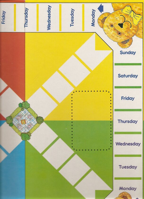 From the front of the box; "See who can reach the picnic first in this exciting race game. A fun way to learn the days of the week and concepts such as week, tomorrow and yesterday." As you move around the board, you pick up cards with comments such as 'two days ago' and 'Next Saturday'. These move you on to new spaces, when you collect the jigsaw piece...