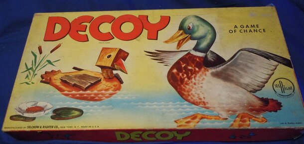 A children's game that imitates duck hunting- Retrieve ducks for high score! Object of the Game is to close blind by placing 8 ducks on the lake. To place two decoys on the lake and to refill 'the blind' with 8 ducks to end the game. Game contents includes the following: 1 red and 1 green die 8 each white, green, black, yellow Ducks 8 Red Decoy Ducks 1...
