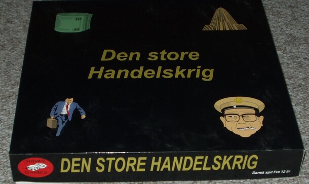 In "Den store handelskrig" you shall buy and sell goods in different countries. Every player gets a mission card. Every mission is different from the other missions. The mission is to get a specific numbers of specific goods, money, diamonds etc. The player who first caries out his/her mission wins the game. The game consists of: 1 board, 2 dice, 6 moving...