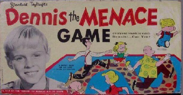 This game from Standard Toycraft represents the Original TV show by this name. The TV show starred Jay North as Dennis, with first Joseph Kearns, who died in 1962 and then Gale Gordon as Mr. Wilson. The object of the game is catch Dennis as he moves around the neighborhood. Players take the part of Dennis' friends Margaret and Tommy and his mom and dad...