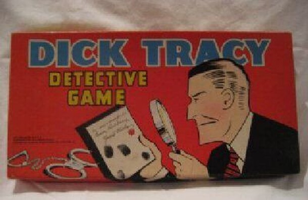 A simple children's race game which takes place on a bright yellow street map of the town. The board and its spaces are illustrated with characters from the Dick Tracy comic strip. Based on the famous character from cartoons and television shows. Components include a gameboard; 5 pawns (4 Deputies, 1 Villain); 28 loot cards (4 ea. Blank; Drug; Apparel;...