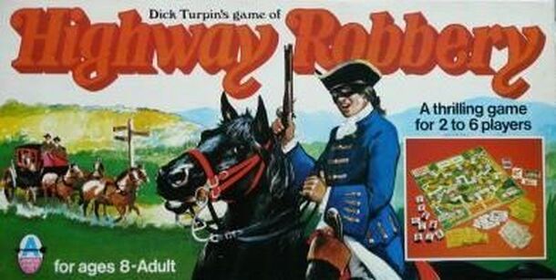 Dick Turpin's game of Highway Robbery "A thrilling game for 2 to 6 players" from Arrow Games Ltd (A Milton Bradley Company). The object of the game is to be the player who has collected the largest amount of Booty by the end of the game. The game ends when the Mail Coach has completed four journeys across the country. One player takes on the role of the...