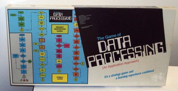 The Game of Data Processing (An Application Approach) consists of advancing discs around a logic flow diagram (the board) and gather points with the goal of becoming a Data Processing Manager before your opponents. Along the way, player can move into different subroutines, pick up "Stimuli" cards, and branch out at decision points within the program....