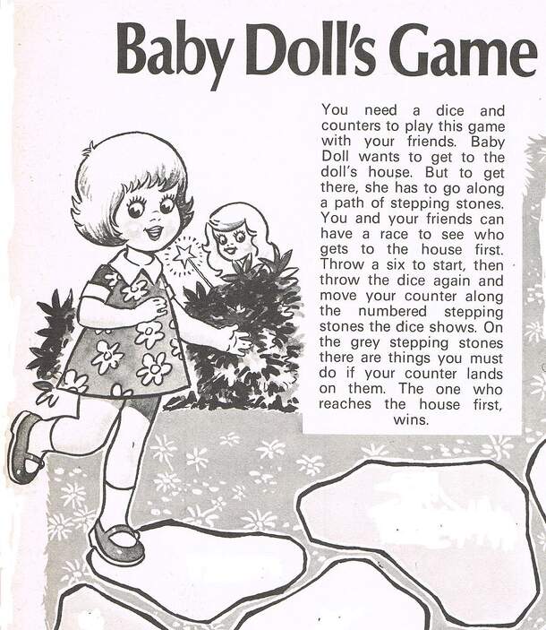 Baby Doll was a comic strip character in Playhour, a favourite comic for the 5's and under. It is a typical Goose-type game and is taken from the 1978 Playhour Annual. Rules You need a dice and counters to play this game with your friends. Baby Doll wants to get to the doll's house. But to get there, she has to go along a path of stepping stones. You and...