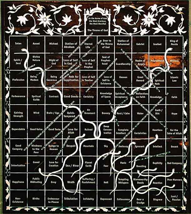 This board game originated in India some time before the 18th century. There were many versions, each based on different belief systems. This Muslim version is known as the Game of Knowledge. It teaches the player about Islam. The player of this game embarks on a journey during which he will learn that the upward path of the spiritual seeker is a gradual...