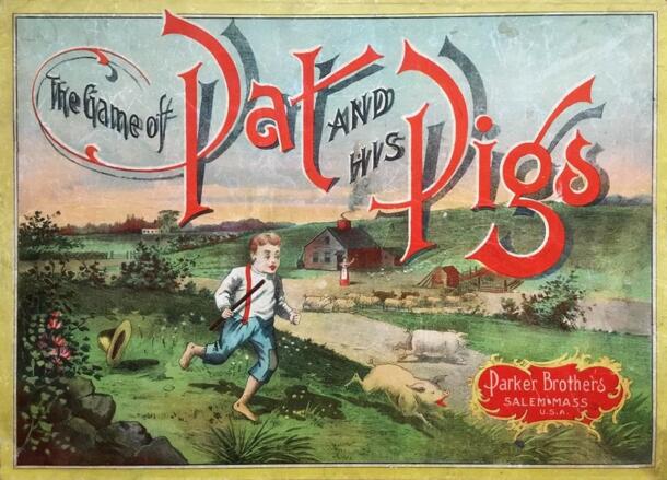 This is a children's race game in which you, the farmer Pat, are driving your pigs to market. Each player receives four pieces (pigs), and a spinner is used to move them individually along the main (broad) path. Landing on a blue space requires you to turn a pig off on to the relevant dotted (narrow) path; conversely, landing on a red dot on a dotted path...