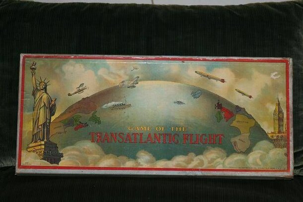 Highlighted by fantastic 1920's artwork, this is an air race between 2 to 4 players. Some players start on North America, some in Europe. Travelling in planes, players try to avoid perils along the way to the other side of the Atlantic Ocean in the least amount of time. The board contains various travel points along the route, showing your planned journey....