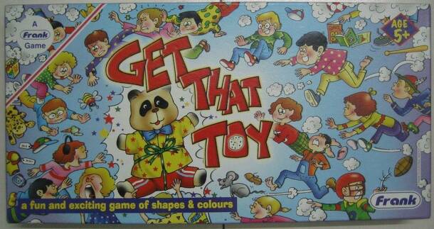 Description from box back: "A fantastic toy is being sold in the toyshop and it's the only one left. You want that toy and you want to get it as fast as possible. So get your shopping carts and go, go, go for that toy! Move your character playing piece on the stairs by moving your shopping cart playing piece around the board and landing on the shape, which...